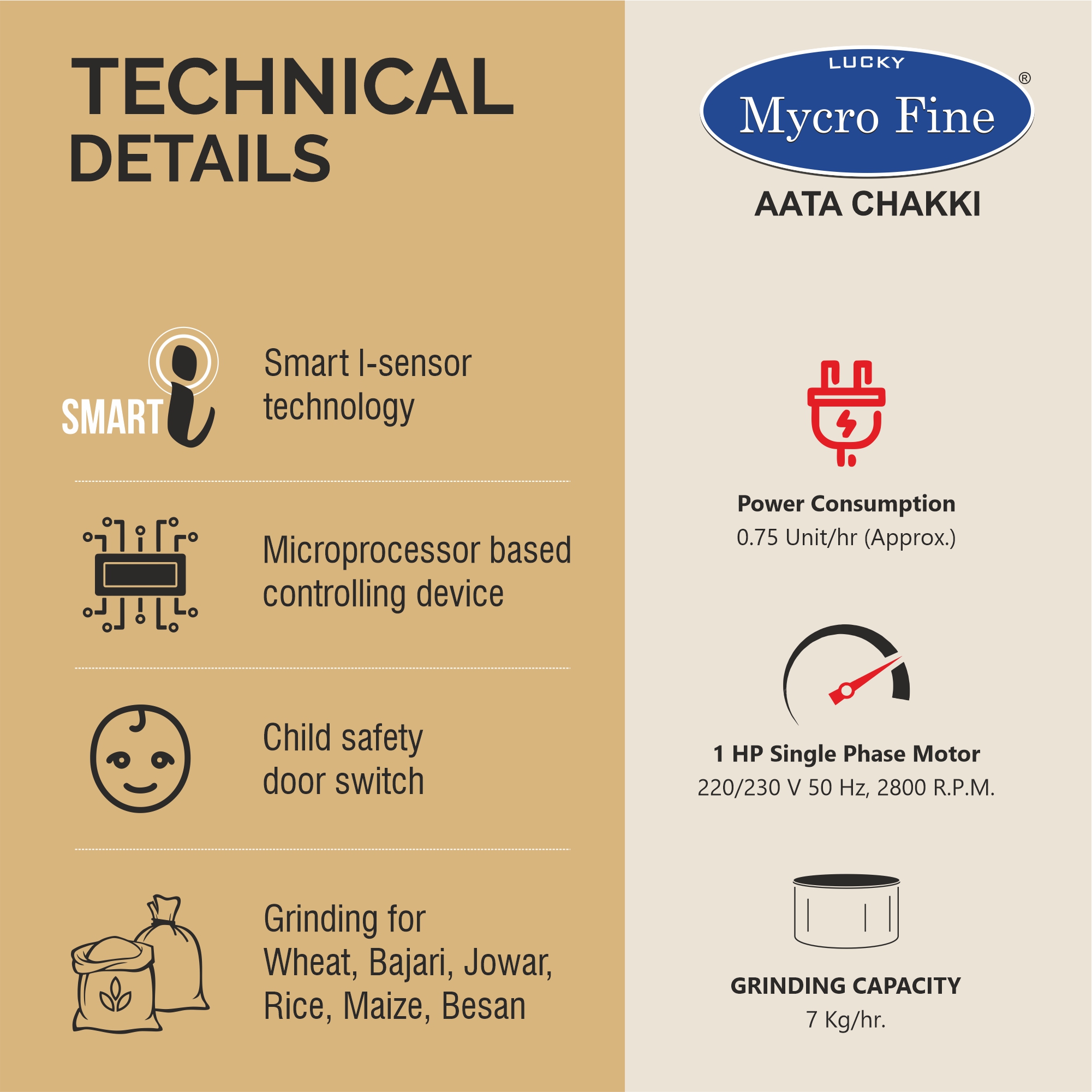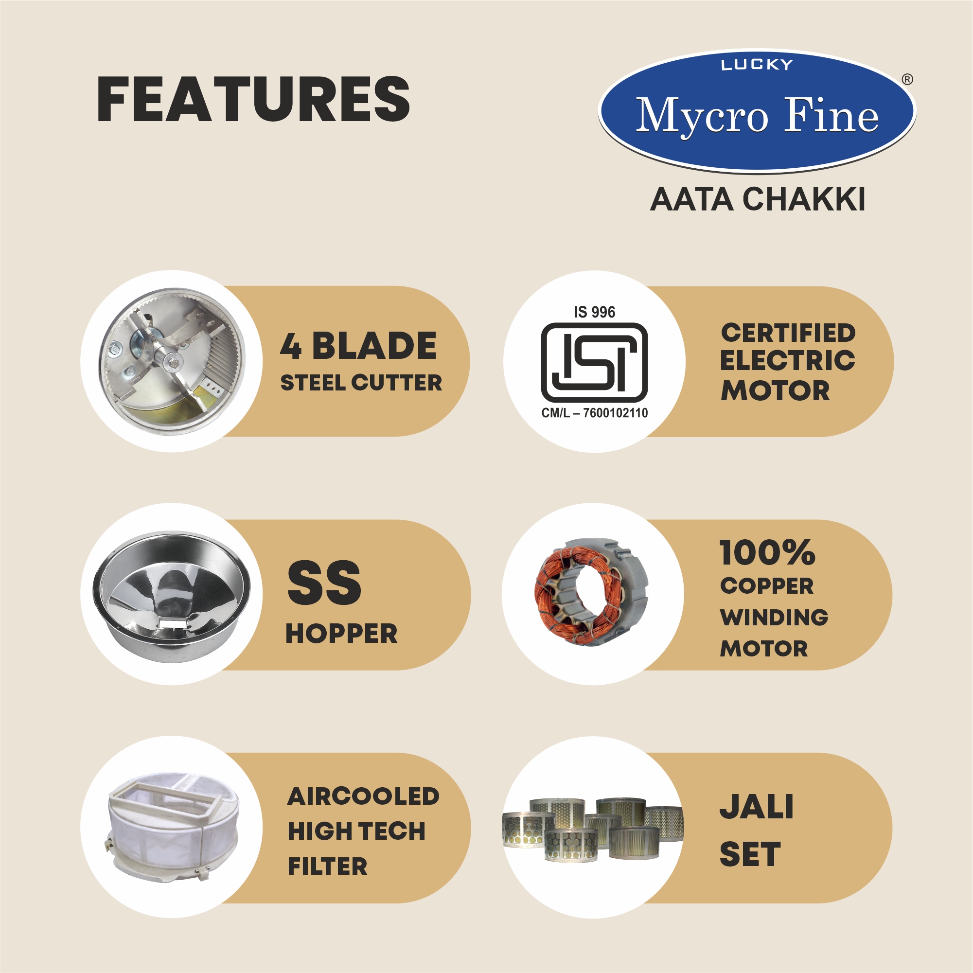 Lucky Microfine Atta chakki is really life long companion for fresh atta.It really grinding all grains including wheat,bajra,juvar ragi ,rice ,makai(corn) in real sense without any problem. I am using this Mycrofine chakki since last 18 years ( beginning Gandhinagar and at present PUNE). Those who are health conscious should keep this appliance at home.