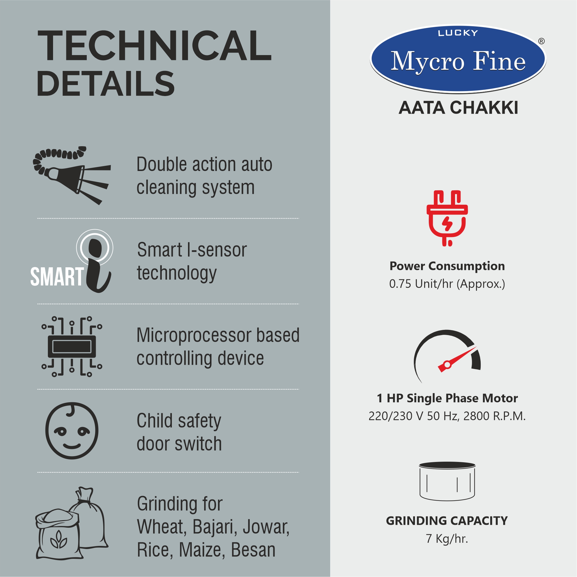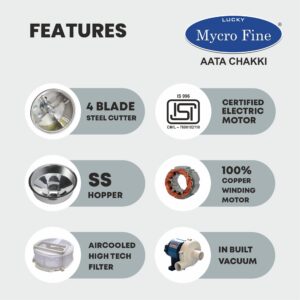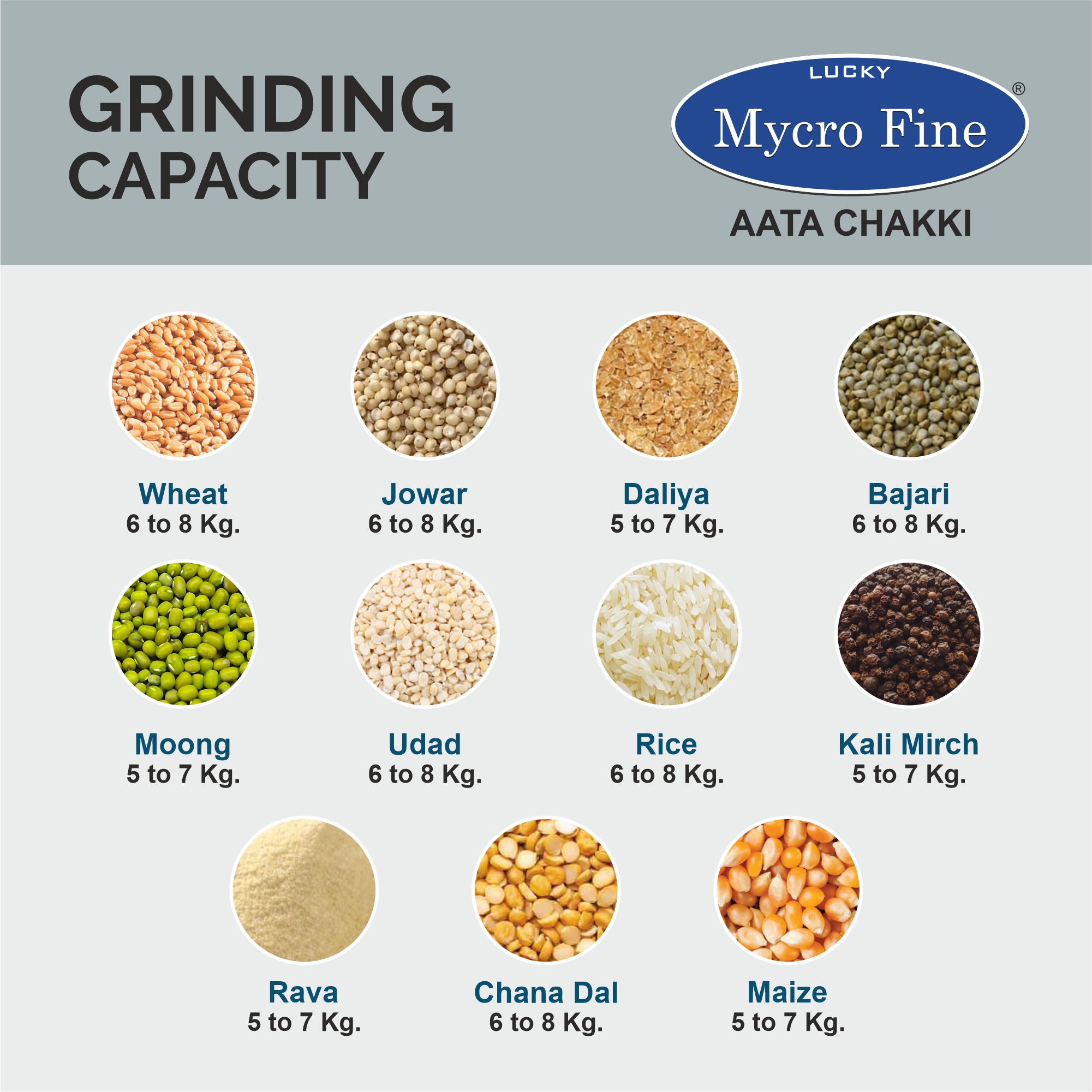 • Lucky Microfine Atta chakki is really life long companion for fresh atta.It really grinding all grains including wheat,bajra,juvar ragi ,rice ,makai(corn) in real sense without any problem. I am using this Mycrofine chakki since last 18 years ( beginning Gandhinagar and at present PUNE). Those who are health conscious should keep this appliance at home.